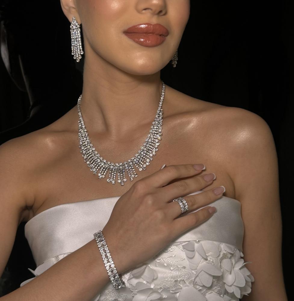 تألقي بإطلالة ملكية لا تُنسى مع طقم الزركون الفضي المصمم بدقة تحاكي فخامة الألماس.