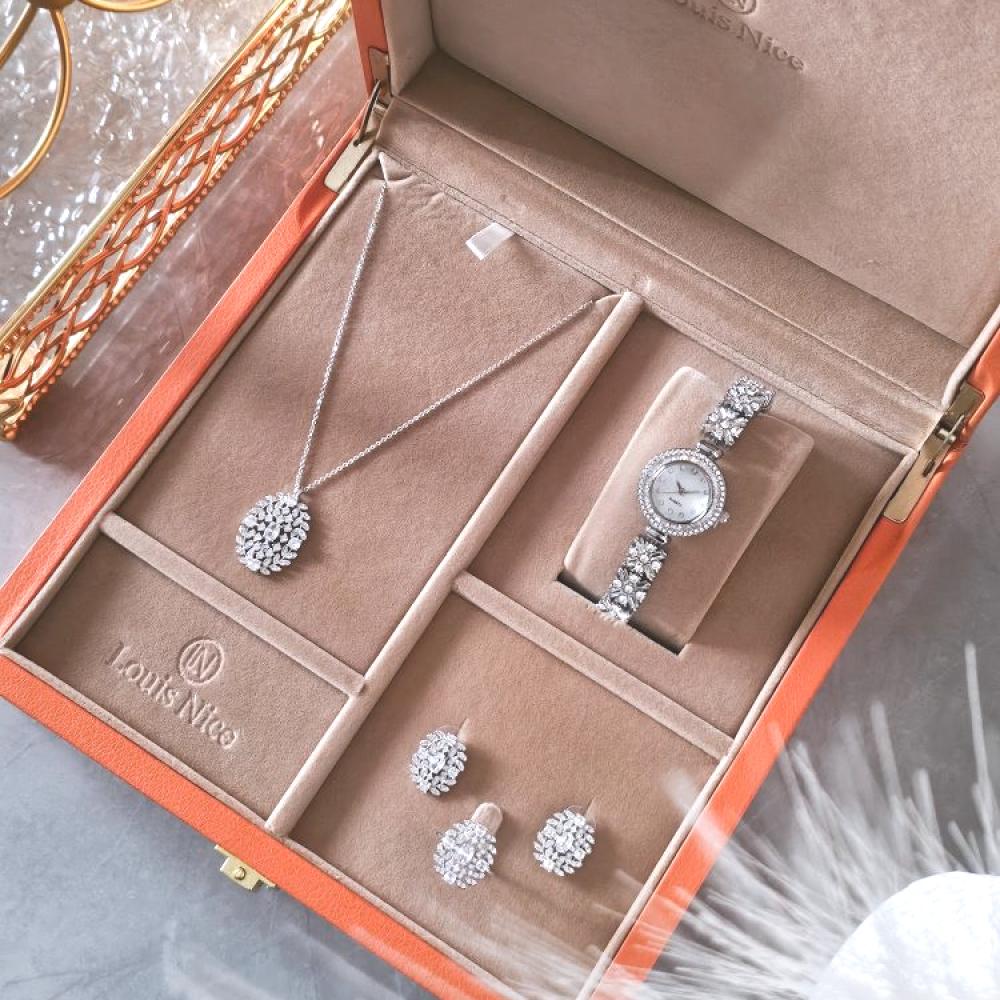 - طقم نسائي أنيق يتضمن ساعة وحلق وسلسال، مصمم ليضيف لمسة من الرقي والأنوثة إلى إطلالتك.