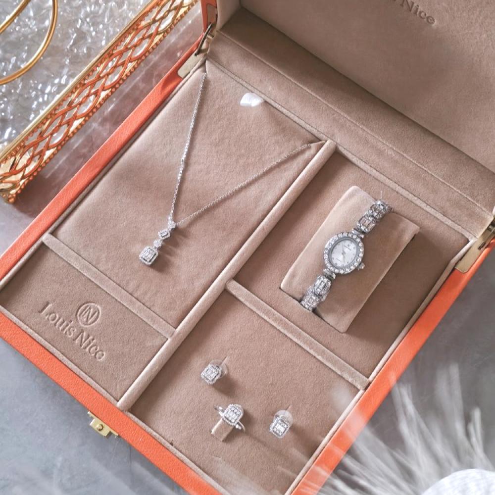- طقم نسائي أنيق يتضمن ساعة وحلق وسلسال، مصمم ليضيف لمسة من الرقي والأنوثة إلى إطلالتك.